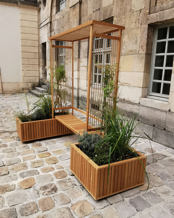Arca est une ombrière végétale en bois de réemploi invitant les usagers à s’asseoir le temps d'une halte au frais. La gamme est composée de jardinières, d'un banc, d'un treillage et d'une arche, permettant de créer des aménagements qui s'adaptent aux différents besoins et lieux: rooftop, cour, jardin... Grâce aux cordes fixées sur l’arche, des plantes grimpantes pourront parcourir l'ombrière pour faire de l'ombre à la belle saison.